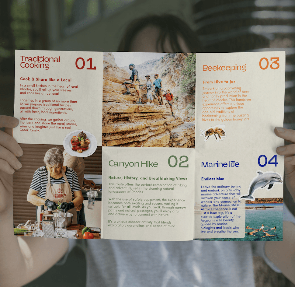 Ο σχεδιασμός της ταυτότητας του Rhodian Roots βασίστηκε στη σύνδεση του brand με την τοπική πολιτιστική κληρονομιά της Ρόδου και ιδιαίτερα με την περιοχή του Έμπωνα. Το κεντρικό σύμβολο αντλεί έμπνευση από τα μοτίβα σταυροβελονιάς που συναντώνται στις παραδοσιακές φορεσιές της περιοχής, μεταφρασμένα σε ένα σύγχρονο γραφιστικό σύστημα.
